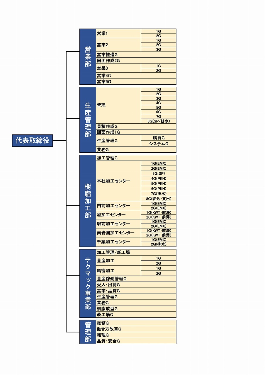 | 事業目的 | 樹脂加工事業部 (1)住宅関連給水給湯プレハブ配管品企画及び製作 (2)前号の事業に付帯関連する一切の事業 テクマック事業部 (1)NC旋盤、マシニングによる各種金属加工製品製作 (2)前号の事業に付帯関連する一切の事業 |