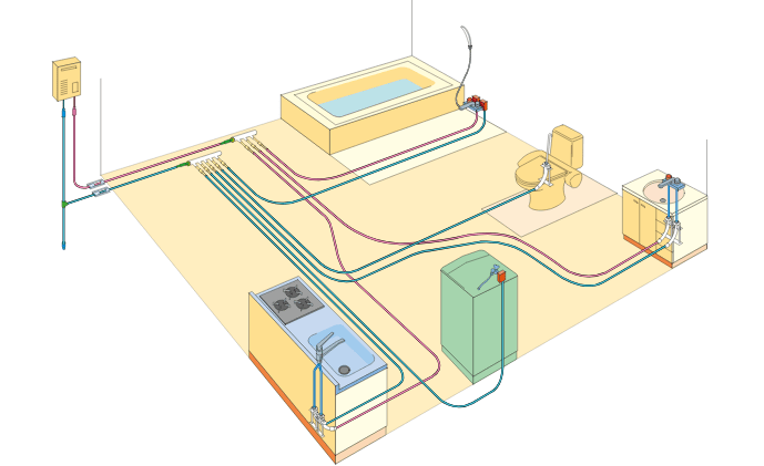 さや管ヘッダー工法とは、従来配管の分岐工法とは異なります。ヘッダーをパイプシャフト内や屋内に設置し、先にさや管で各給水栓まで埋め込み配管やころがし配管等で配管しておき、後からさや管内に樹脂管を通管する工法です。